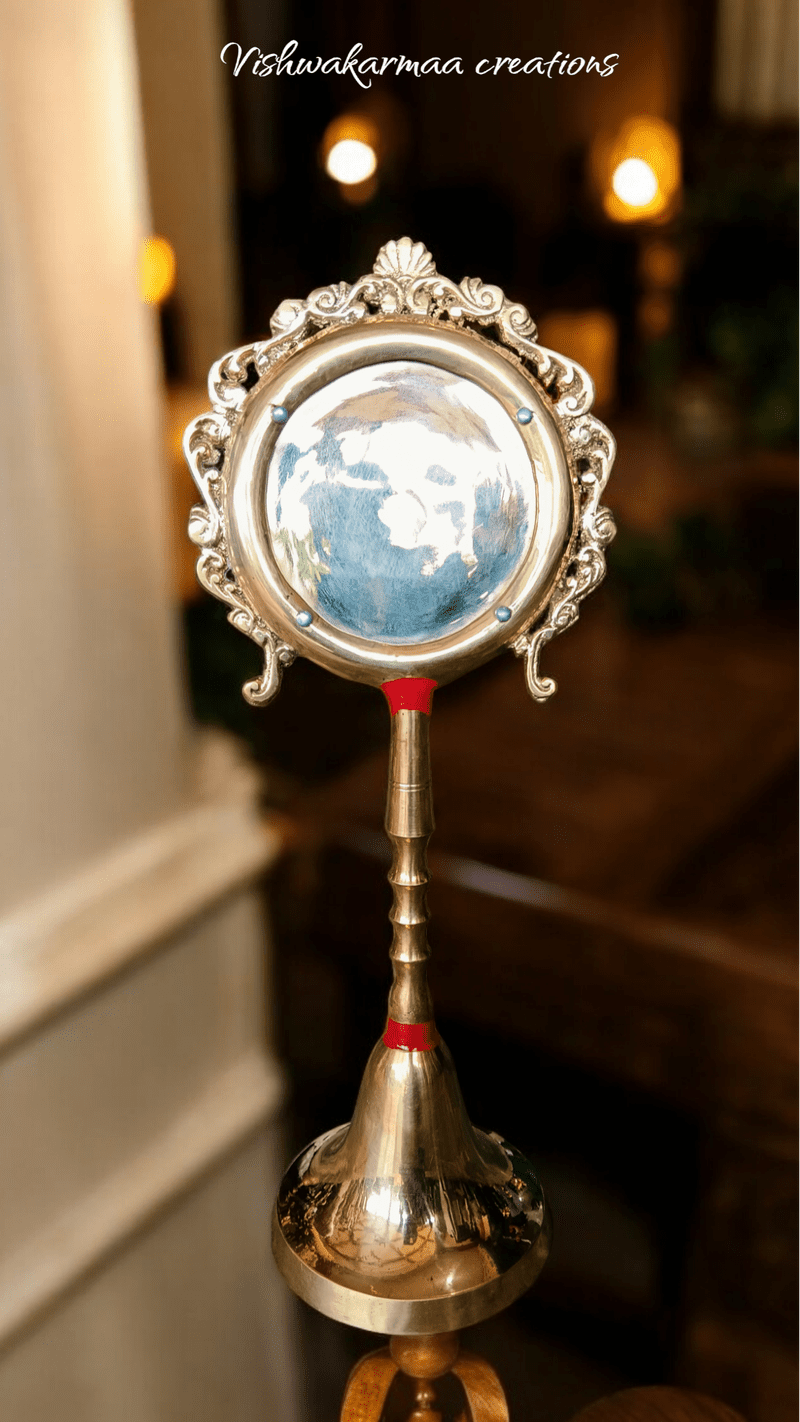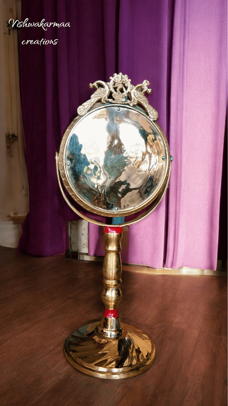 The Snana Darpana is a sacred brass mirror deeply rooted in the spiritual traditions of Jagannath Puri. Used daily during the ritualistic bathing ceremonies of Lord Jagannath, this beautifully crafted mirror is an essential part of the temple’s revered practices. The mirror features intricate engravings that are reflective of the rich cultural heritage of Jagannath Puri.